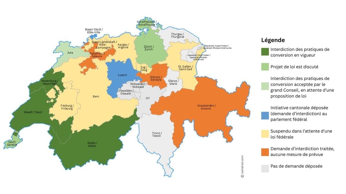 La plupart des cantons suisses estiment qu'il est nécéssaire d'agir et sont entrain de mettre des lois cantonales en place pour interdire les pratiques de conversion.
